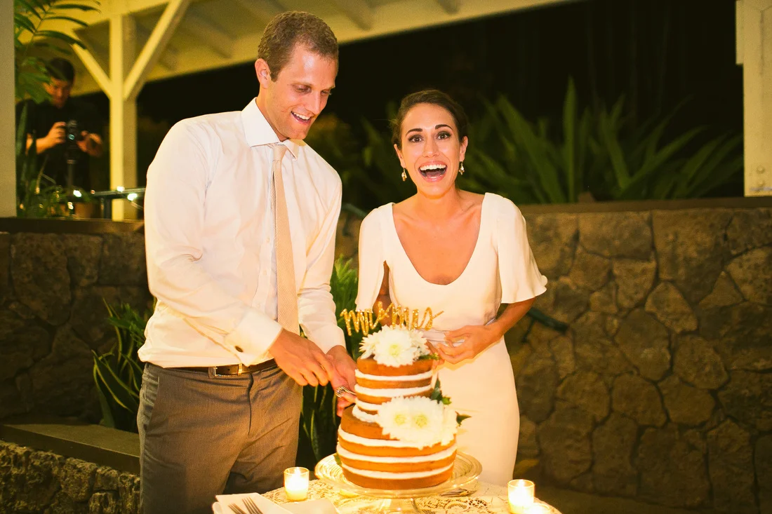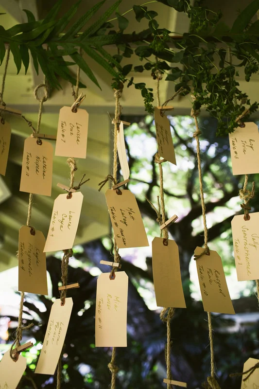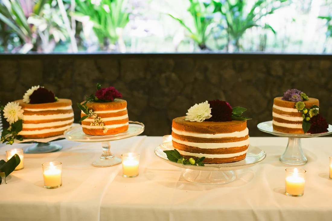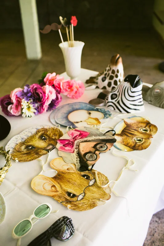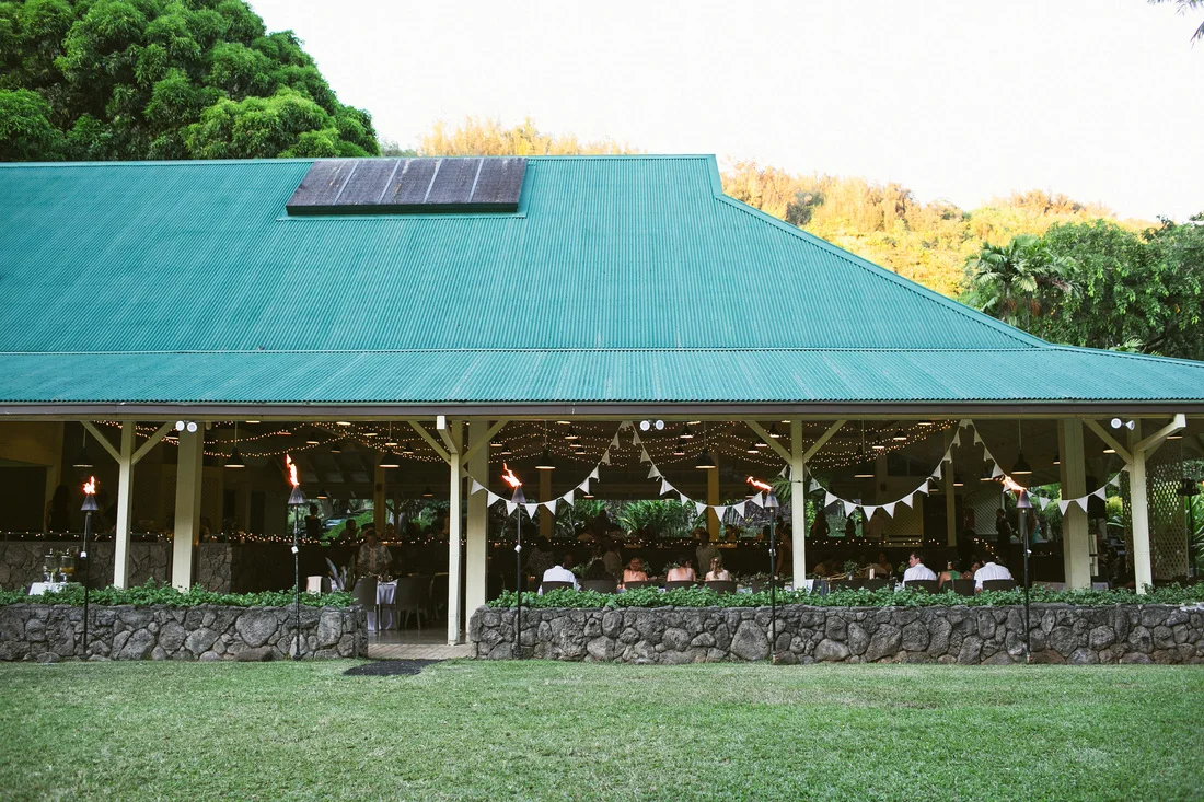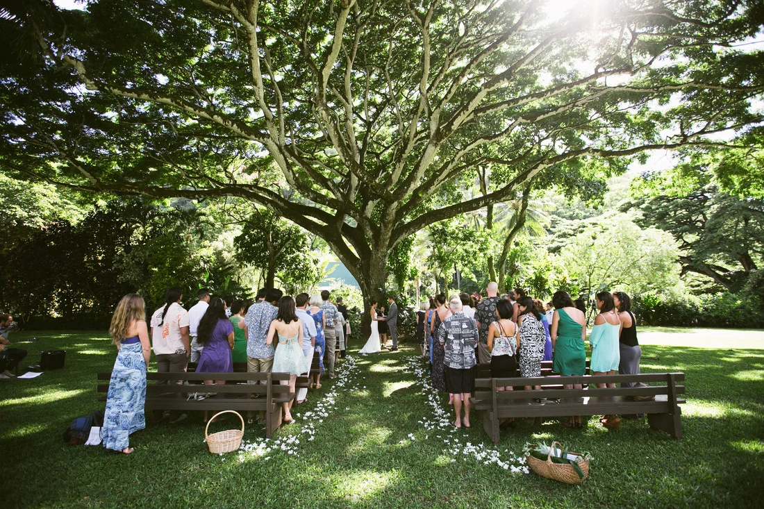 It is not every day that I get to work with clients who share my eclectic and bohemian style. It was so much fun to challenge the traditional with every part of this wedding. The couple chose Waimea Valley as their venue for the lush botanical gardens and their dedication to keeping the grounds a nature preserve. They worked with the on-site caterer to create a menu that featured all local and organic ingredients. The bride wanted to include as many hand crafted elements as possible. All of the couple's friends and family (and us at Love Letter Weddings) pitched in to make the invitations, photo booth, centerpieces, escort cards, signage and bunting. My all time favorite was the toy animals the bride collected and spray painted gold for the guest favors. Each one had a satchel tied to its back with local Hawaiian candies inside. She told me that she wanted her guests to leave laughing. Between the DIY decorations and the musical talent of so many of the couple's friends you could truly feel the love in the air all night long!