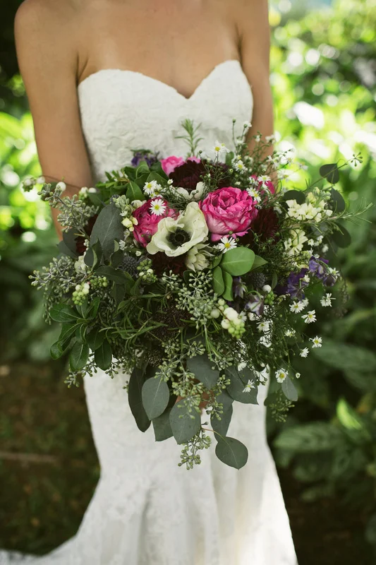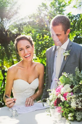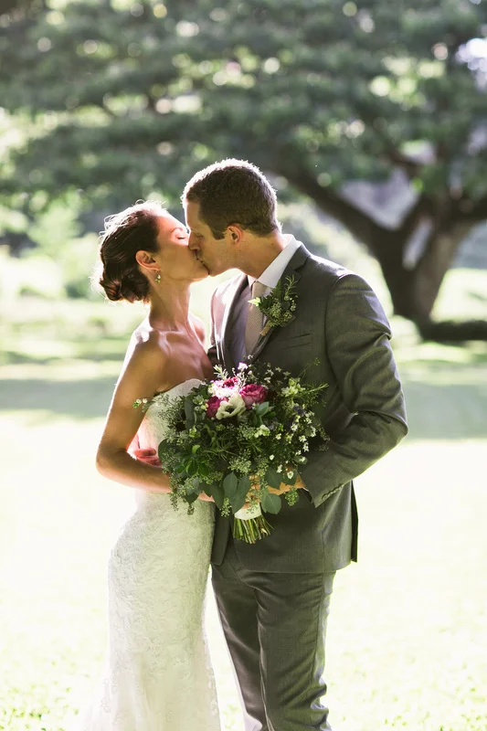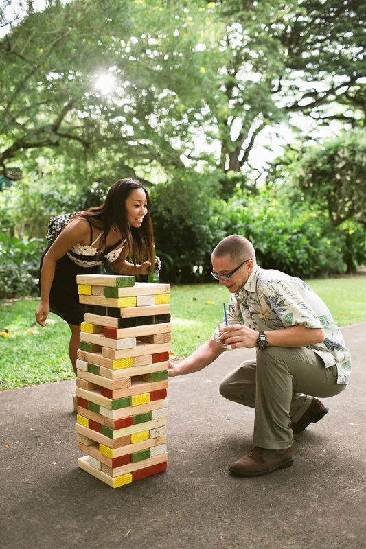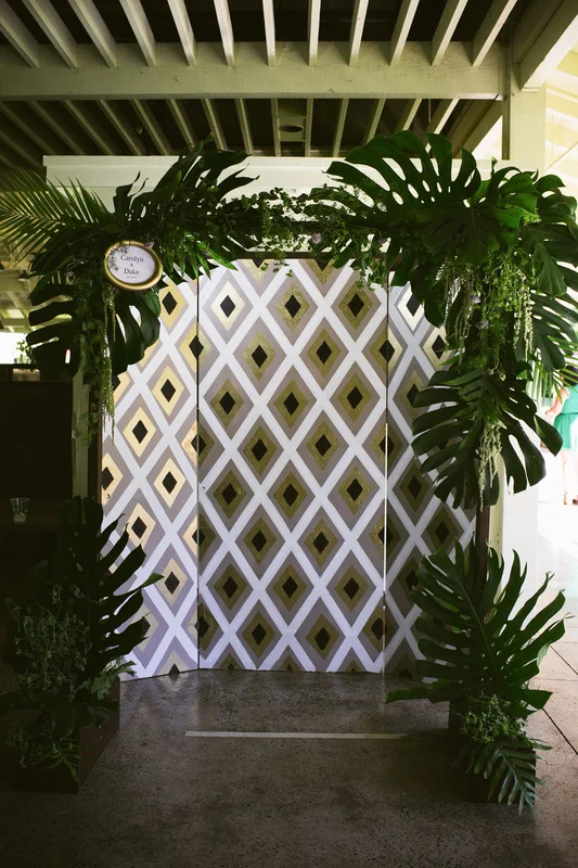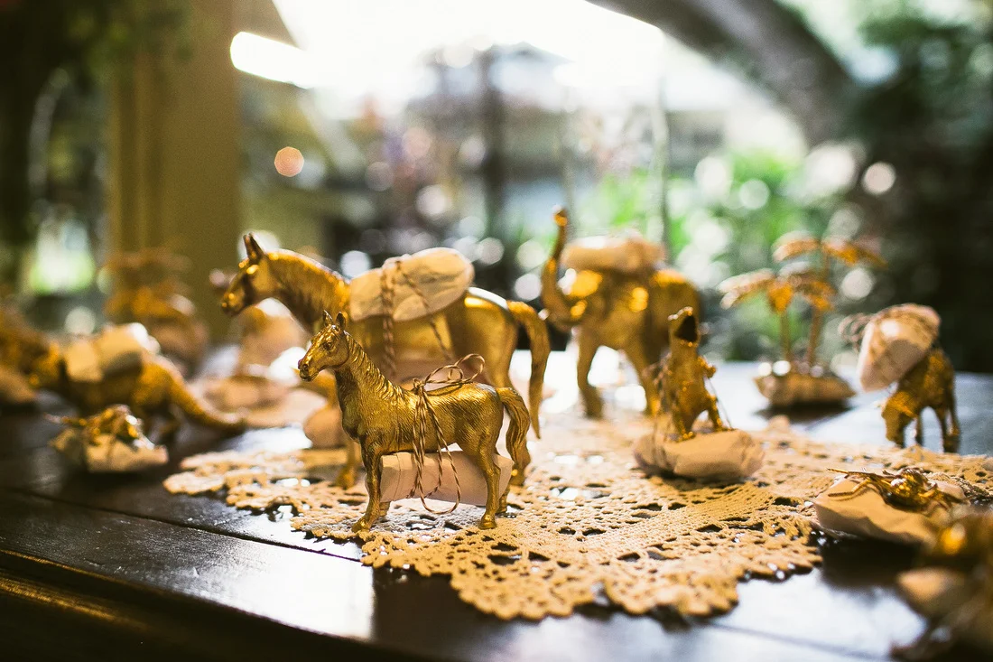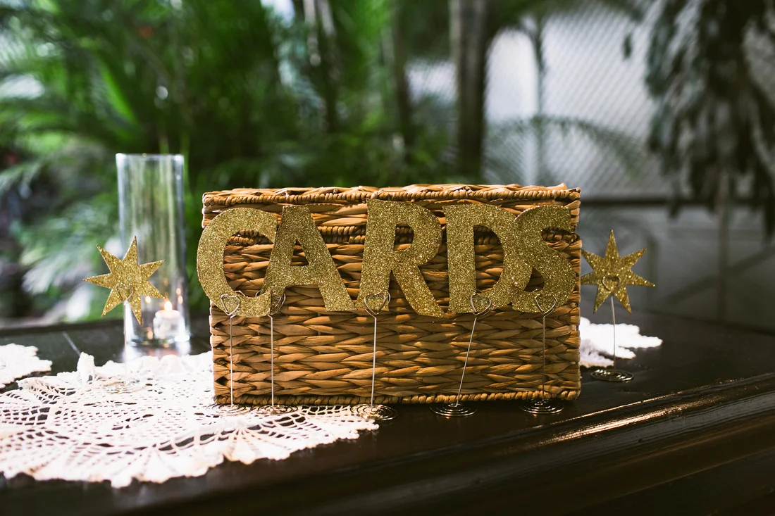 It is not every day that I get to work with clients who share my eclectic and bohemian style. It was so much fun to challenge the traditional with every part of this wedding. The couple chose Waimea Valley as their venue for the lush botanical gardens and their dedication to keeping the grounds a nature preserve. They worked with the on-site caterer to create a menu that featured all local and organic ingredients. The bride wanted to include as many hand crafted elements as possible. All of the couple's friends and family (and us at Love Letter Weddings) pitched in to make the invitations, photo booth, centerpieces, escort cards, signage and bunting. My all time favorite was the toy animals the bride collected and spray painted gold for the guest favors. Each one had a satchel tied to its back with local Hawaiian candies inside. She told me that she wanted her guests to leave laughing. Between the DIY decorations and the musical talent of so many of the couple's friends you could truly feel the love in the air all night long!