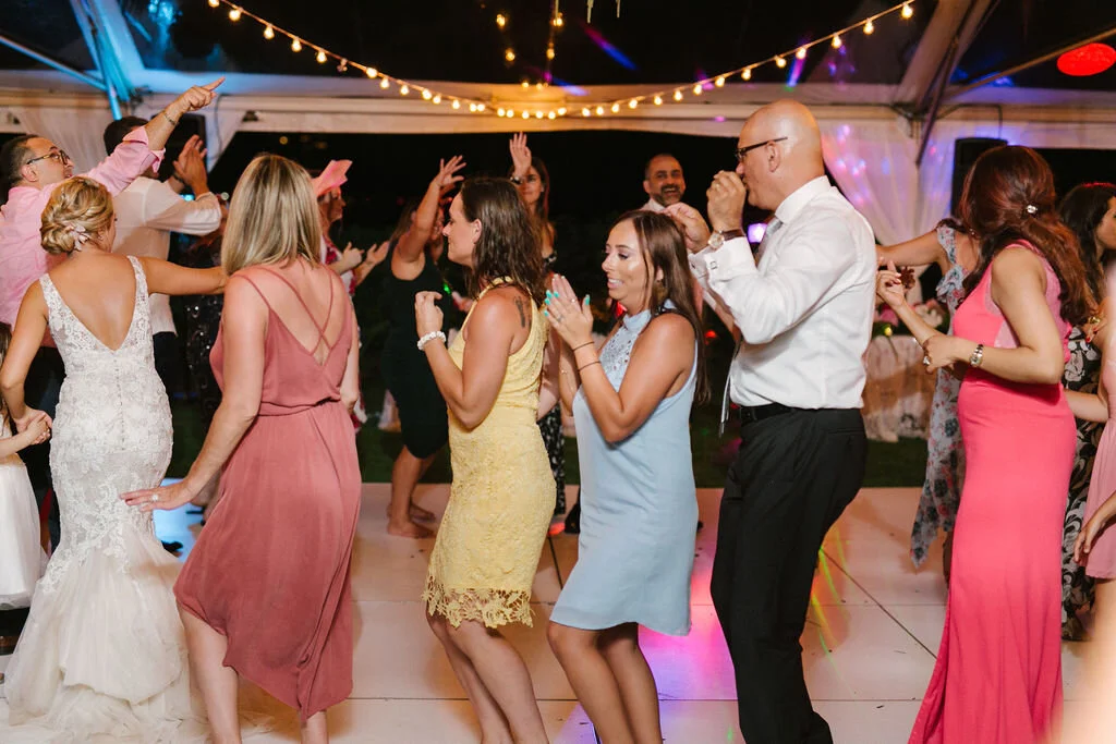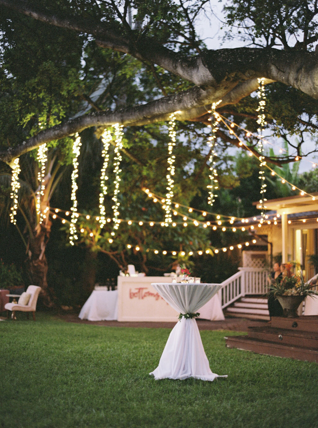 Backyard weddings are some of my all time favorites. There is nothing more special than choosing a venue that has sentimental value and that you can go back and visit at any time. With that being said, there are always some trickier elements when you are working with a property that is not set up to be a wedding venue. In this particular case, we wanted to keep the wear and tear down on the beautiful hardwood floors so we had to find a creative way to get the guests to enter the backyard. Luckily, there was a darling palm lined pathway around the side and with a few strategically placed lanterns and flowers, it made the guest entrance extra special. Other features of this wedding included a stunning semi tropical circle arch for the ceremony, an elaborate Persian fresh fruit table and twinkly lights hanging from everywhere!