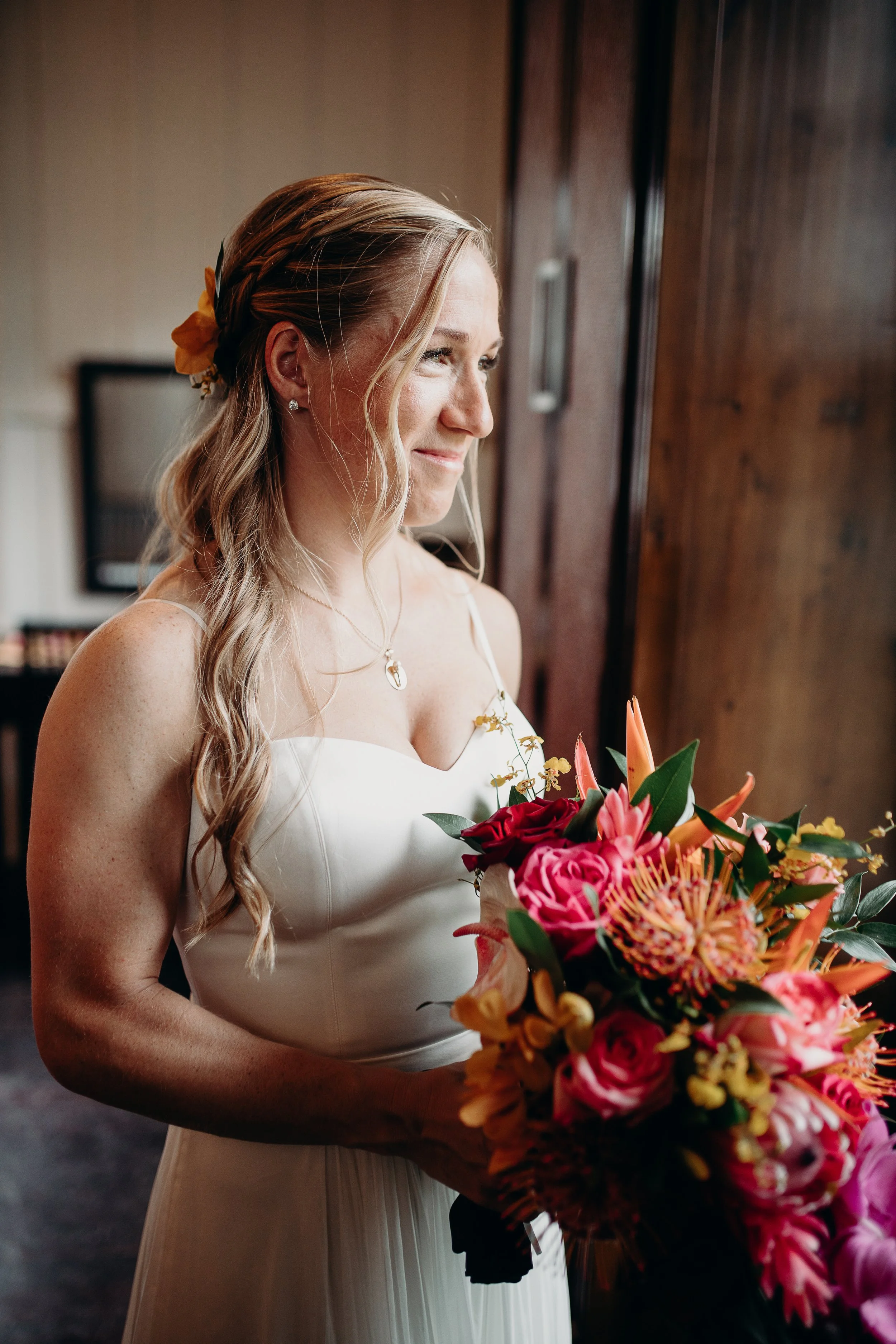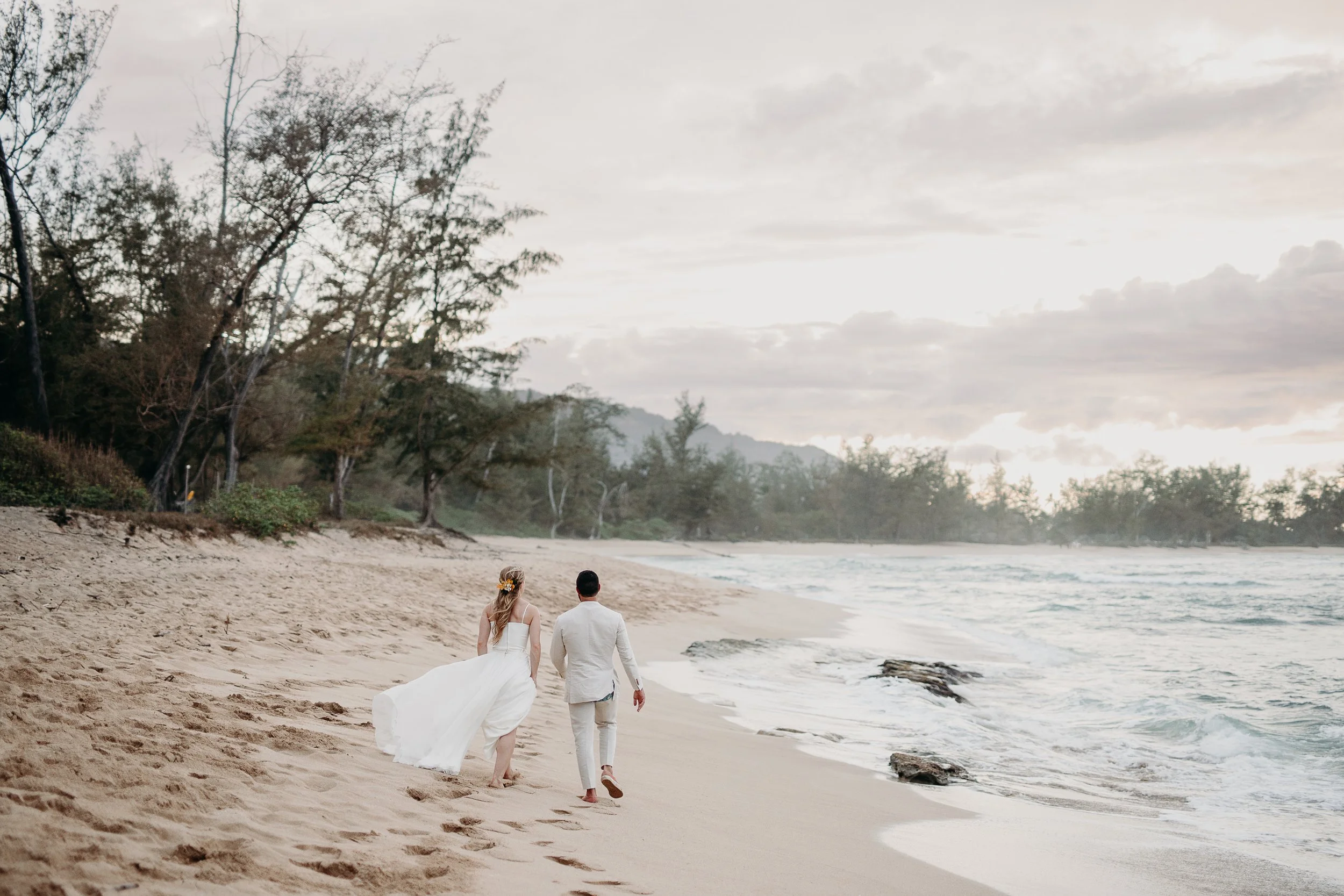 Instead of a traditional seating configuration at the ceremony, the bride and groom walked over to the ceremony site with all their guests. The groom’s cousin performed a short and personal ceremony while guests sipped cocktails from coconuts.