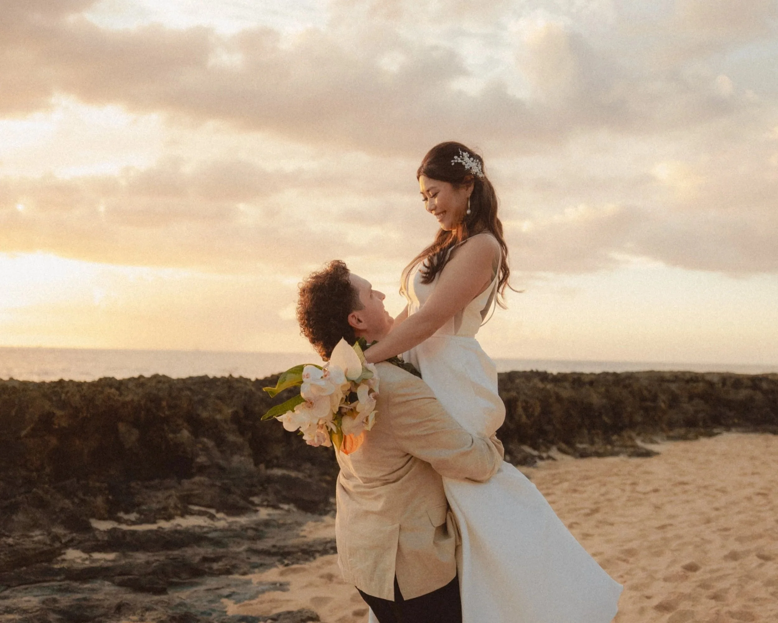 Gina and Tim’s wedding at Lanikuhonua was one of those days that felt joyful from the moment it began. Set against the sweeping ocean views of Oʻahu’s west side, their celebration unfolded with so much heart, personality, and playful energy. It was a true reflection of who they are together.